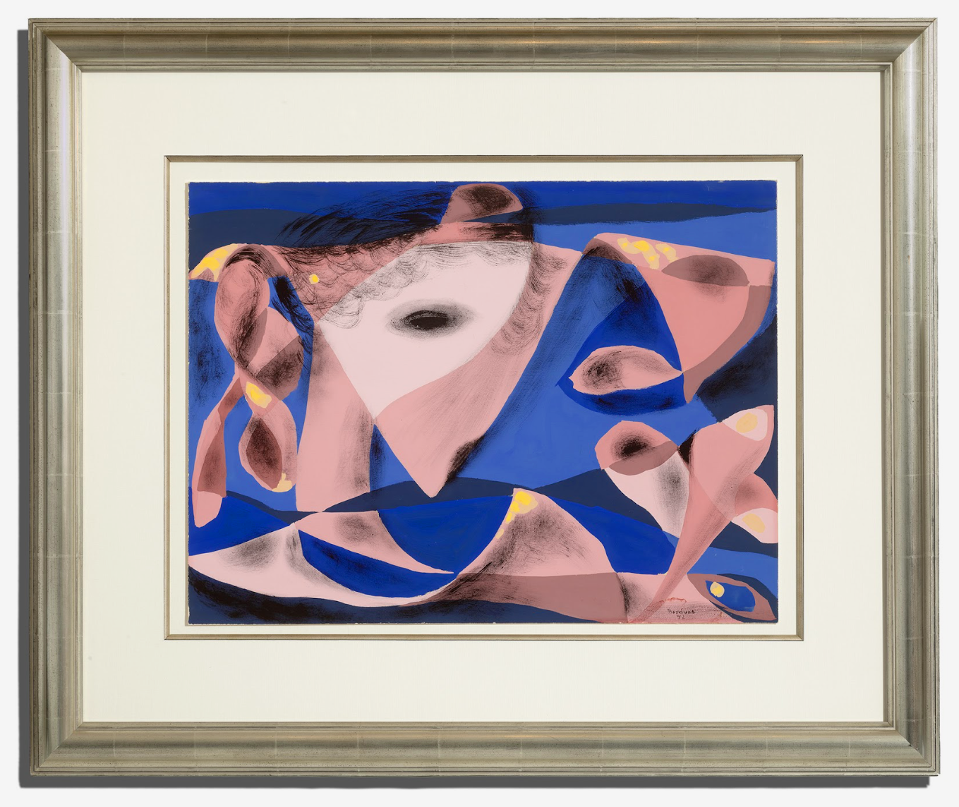 Abstraction no. 10 ou Figure athénienne belongs to the sixty or so gouaches painted by Paul-Émile Borduas during the winter of 1942, forty-five of which were exhibited from April 25 to May 2, 1942, at the Foyer de l’Ermitage in Montreal, under the title Surrealist Works of Borduas. This exhibition is particularly important because it is generally recognized as the starting point of the Montreal Automatiste movement. On this occasion, Borduas described to his friend, the art critic Maurice Gagnon, the “automatic” aspect of his approach, emphasizing the intuitive nature of the creative act: “I have no preconceived ideas. Placed in front of the blank sheet of paper with a mind free of all literary ideas, I obey the first impulse. If I have the idea of applying my charcoal to the centre of the sheet or to one of the sides, I apply it without hesitation, and so on. A first line is drawn, dividing the sheet. This division of the sheet triggers a whole thinking process that is always executed automatically.” Influenced by his recent discovery of Surrealism and his reading of André Breton’s Château étoilé, the artist no longer aimed to imitate or represent the outside world, but to adapt the means of painting to his own inner vision. The Montreal exhibition was a resounding success, with thirty-seven of the forty-five works on display being sold. It was Gilles Bernard who acquired the gouache Abstraction no. 10 ou Figure athénienne for $50.