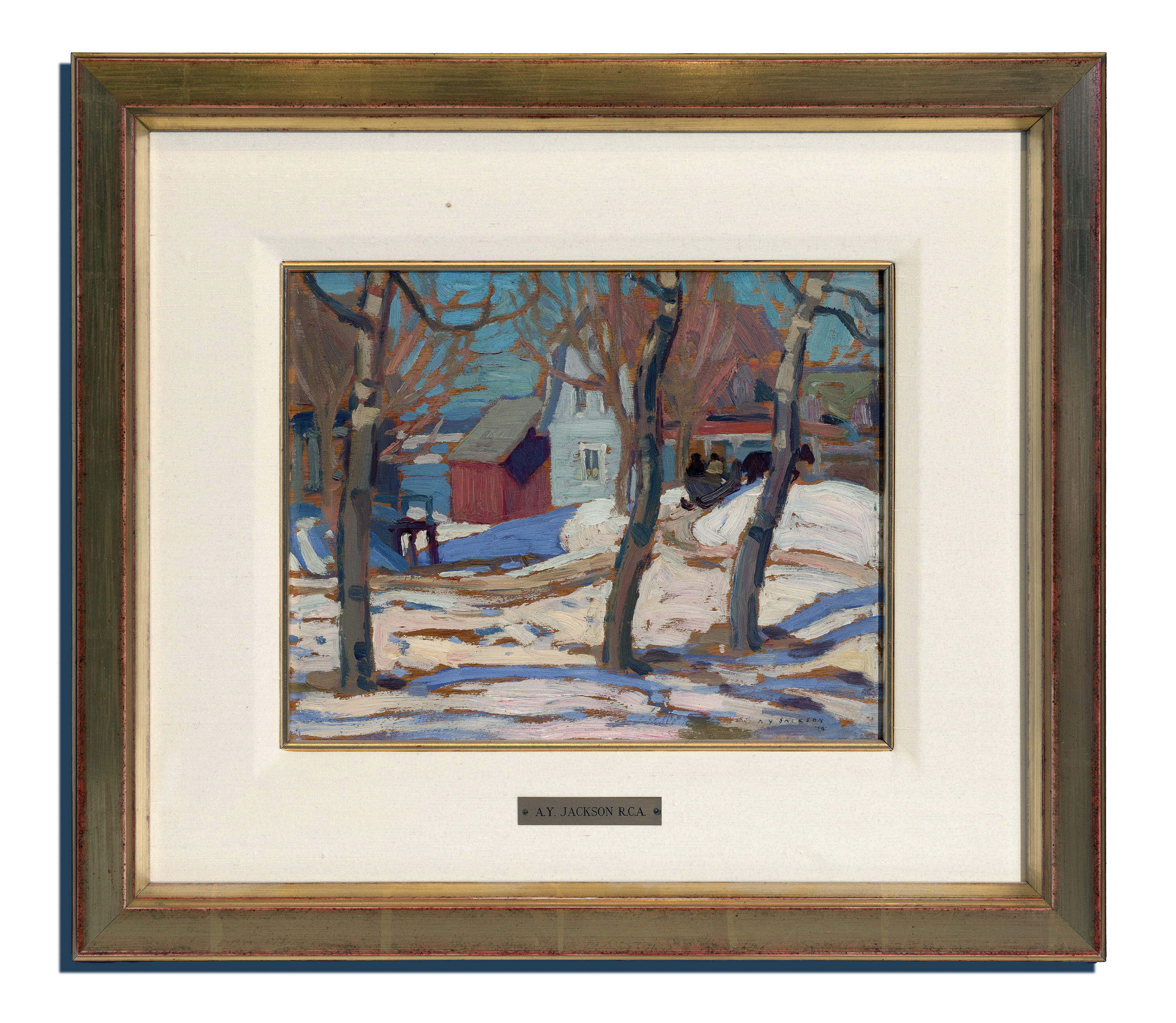 Our prime period oil sketch “Cacouna, Quebec, 1920” compares to Jackson’s finest, most recognizable subject matter: his signature horse and sleigh set prominently within the villages or farmhouses of picturesque French Canada. Other sketches of similar quality have sold at auction setting price records as collectors vie to acquire these rare and desirable works.