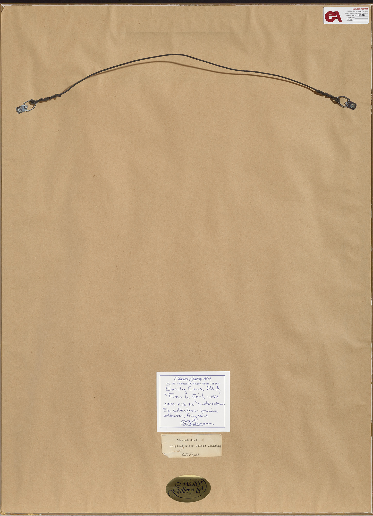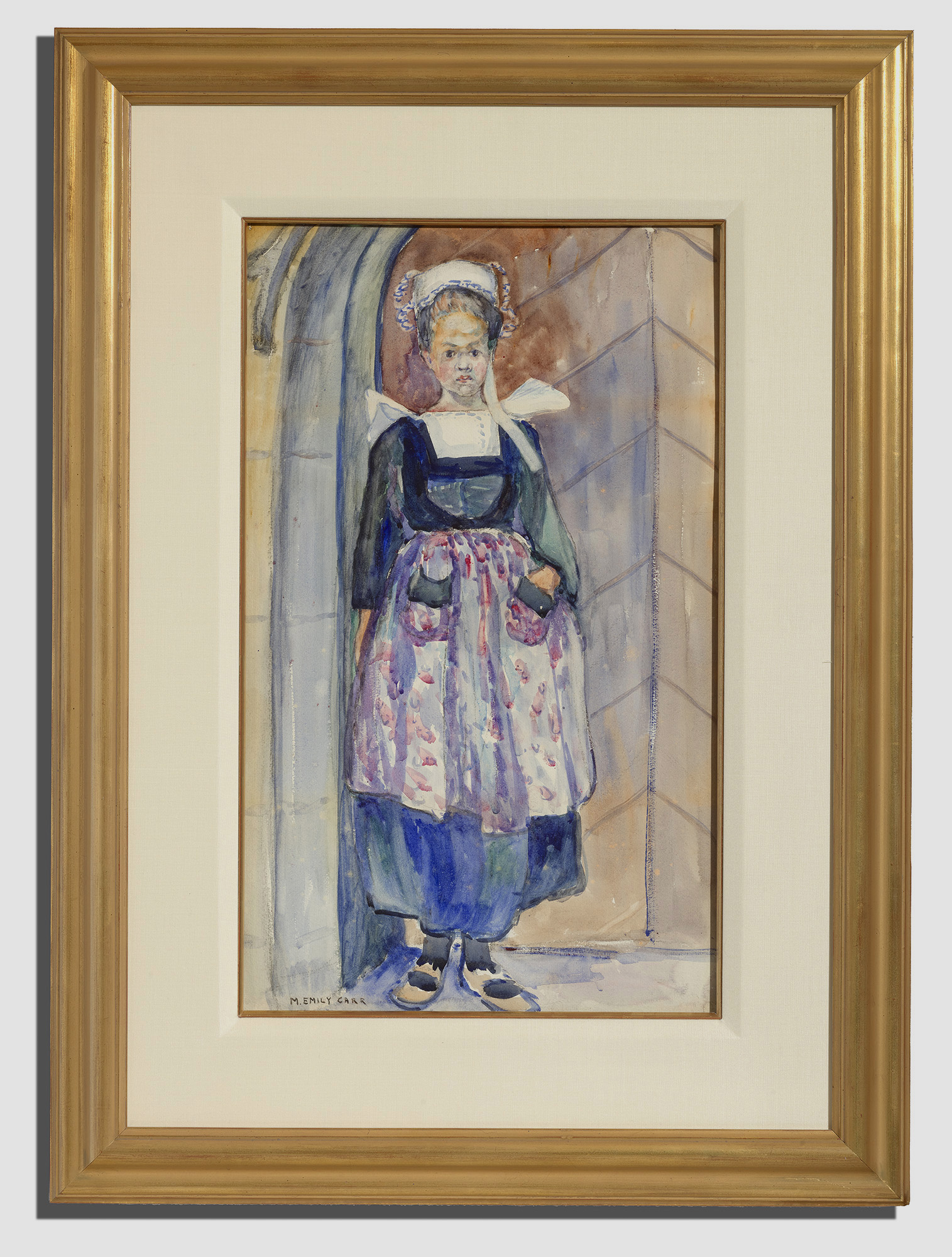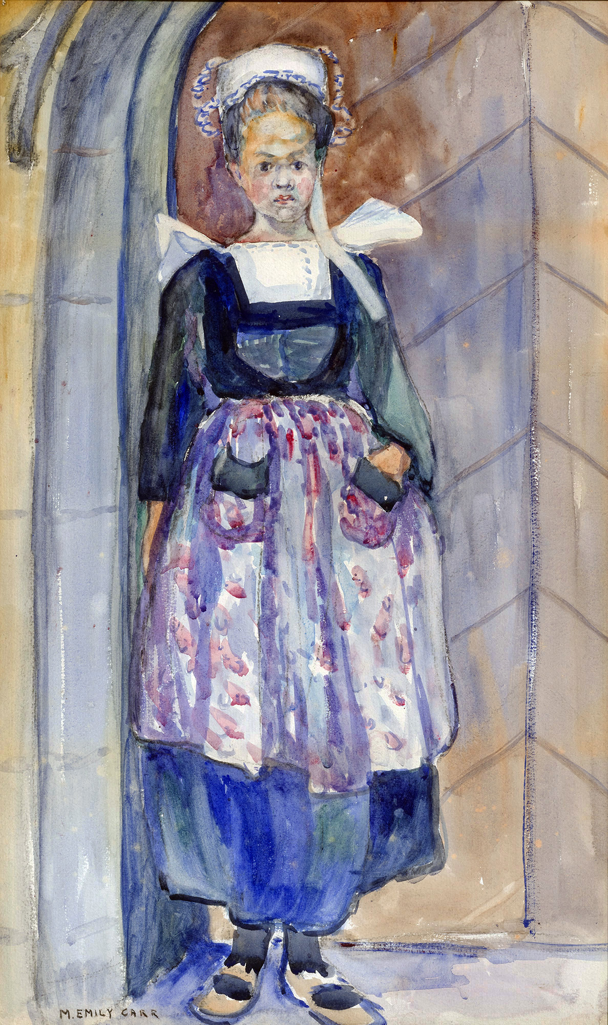 Emily Carr’s avant-garde style emerged from her artistic training in France, where she studied under modernist painters Harry Gibb and Frances Hodgkins. “French Girl” was painted by Carr towards the end of her stay in the late summer of 1911, when the artist spent several weeks honing her watercolour skills in a coastal town in Brittany. After a tremendously productive and fulfilling experience with Gibb during the summer of 1911, Emily Carr was still not yet ready to return to Canada, detached from the art centres and critics, for she feared that she “would go home and drown in the uncharted sea of tremendousness.” She had heard that an artist from New Zealand named Frances Hodgkins was leading watercolour classes in the small port town of Concarneau, on the coast of Brittany. “An artist with an exuberant Late Impressionist technique”, Hodgkins was a brilliant watercolourist whose work displayed spontaneity and imaginative colour combinations. Carr spent the late summer and early fall of 1911 in Concarneau with Hodgkins, creating watercolour depictions of the crooked cobblestoned streets and its residents of the old fortified town. The artist said of her stay in Concarneau: “I worked with fresh gay vigor sitting in wine shops and sail lofts on the quay or back in fields. I learnt a lot and was happy.” Painted during this formative stay in Concarneau, “French Girl” is a rare and revealing example of Carr’s engagement with the human figure. The watercolour depicts a young Breton woman standing in a stone doorway, dressed in the characteristic regional costume, including a starched white bonnet, black bodice, and patterned apron. Carr found that her new Fauve palette could easily be incorporated into this traditional medium. The softened contour lines and modulated washes of violet, rose, and indigo reveal the artist’s transition from academic naturalism to the more liberated, painterly approach that defined her later work. Maria Tippet remarks that “the heavy broken line with which Hodgkins outlined her forms quickly became the structural basis for almost all of Carr’s Concarneau work.” The strong, loose black outlines of the buildings in “French Girl” show Carr’s increasing ease in the medium and diminishing concern with detail and realism. Ian M. Thom writes: “The watercolours from the summer of 1911 are perhaps the most important of the works which Carr executed in France. As a group they have an assurance and immediacy which is not always felt in the oils.” Carr’s stay in Concarneau marked a period of profound change in her watercolour painting, serving as an excellent conclusion to her fourteen-month sojourn in France. She had taken the final leap from the traditional school to the modern in her colourful interpretations of the Brittany coast. Carr visited Paris briefly in the fall, where two of her paintings were being shown in the Salon d’Automne at the Grand Palais. In November 1911, she returned to Victoria a more mature, skilled, and confident artist, and held an exhibition of her French works in March 1912. In an article published by “The Vancouver Province” on March 27, 1912 regarding her exhibition, Carr was described as “an enthusiastic disciple of the modern French school of art.”
