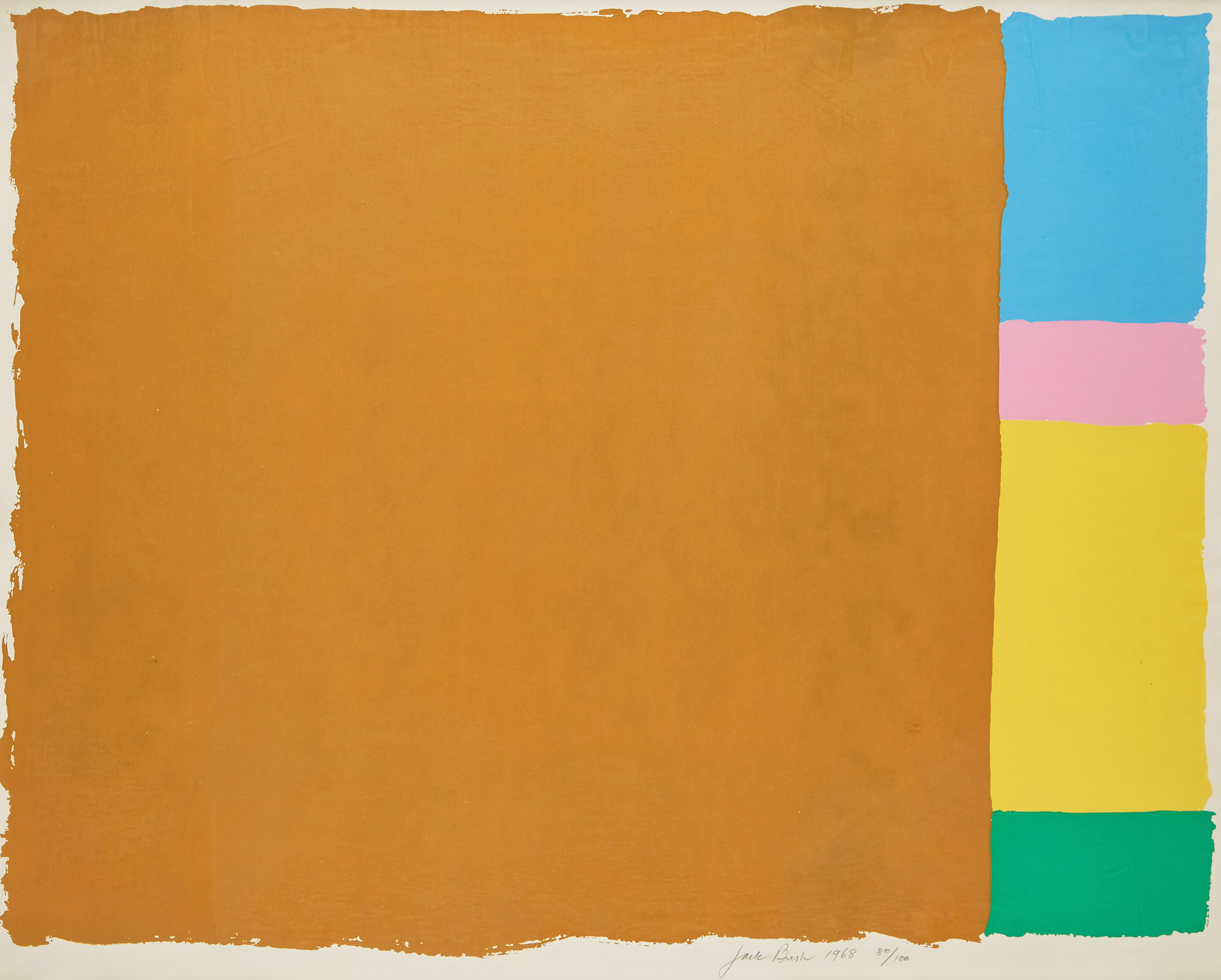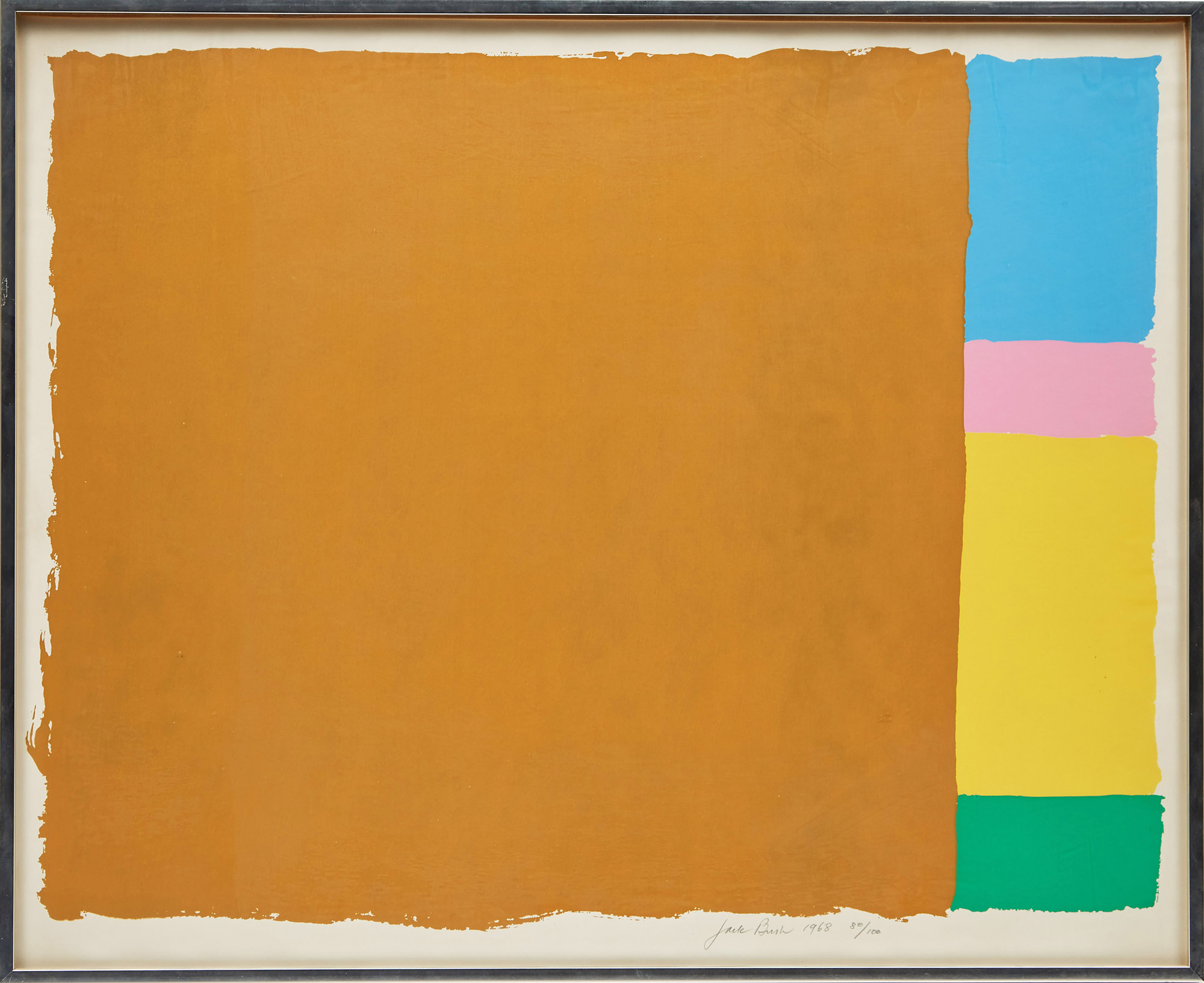As a member of the Painters Eleven, he met the influential New York City art critic Clement Greenberg who encouraged him to simplify his compositions using all-over coverage of thinly applied bright colours, incorporating smooth opaque streaks of bars of colour or simple geometric shapes. Bush’s printmaking career included collaborations with the major dealers of the time: Leslie Waddington in London, Andre Emmerich in New York and David Mirvish in Toronto and are a translation of his painterly vocabulary onto a different medium.