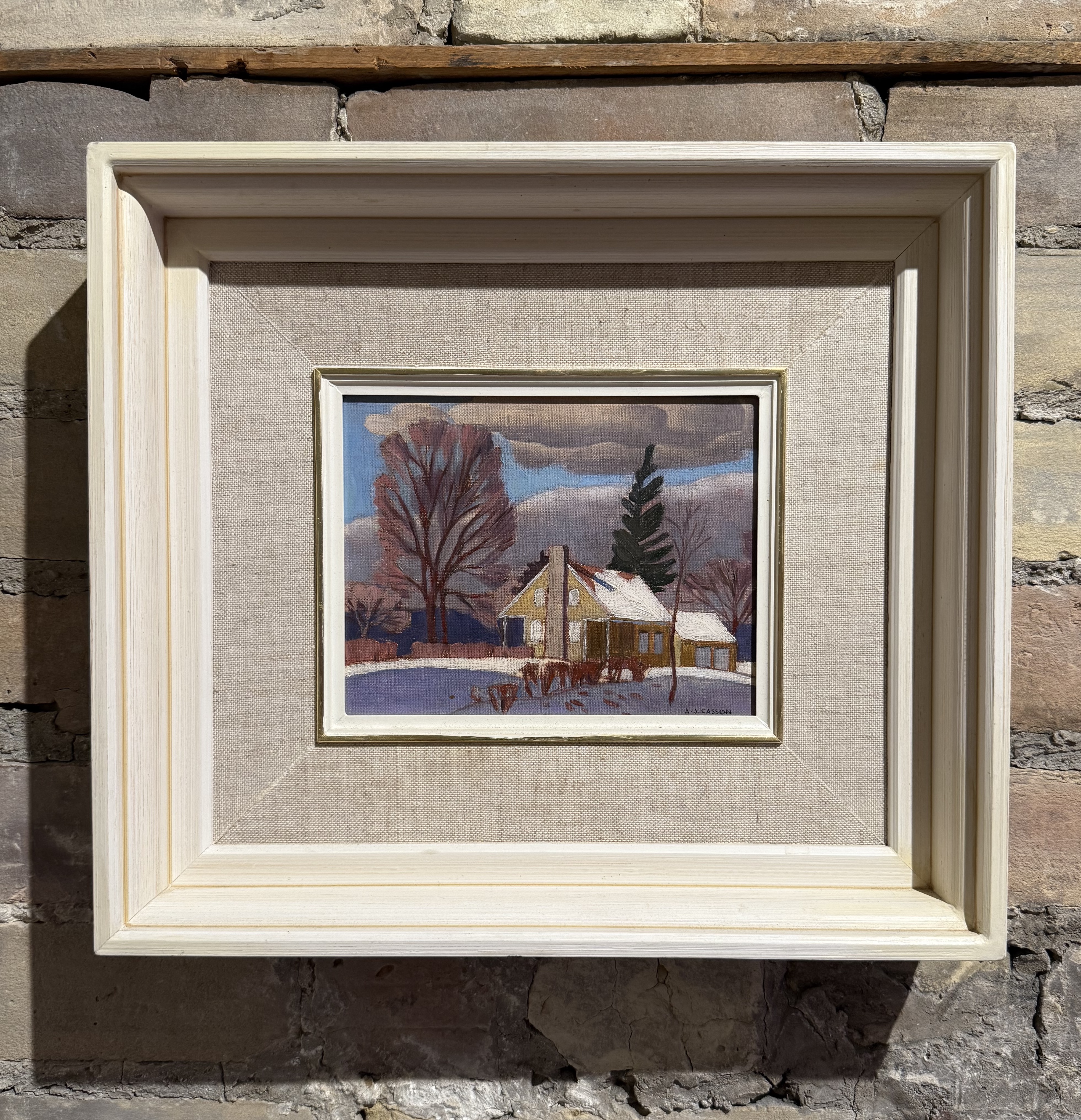 Alfred Joseph Casson lived most of his life in Toronto where he was born in 1898. His first experience of small-town Ontario was in childhood; he would make frequent visits to Meadowvale, a village west of Toronto, where he had family ties. Villages outside of Toronto, such as Elora, Salem, Uxbridge, and in this instance, Weston, were among the many places he depicted in the 1920s and 1930s. Working full-time at a commercial art firm until 1959, Casson could only leave the city to paint and sketch on weekends and holidays. “Morgan Cottage, Weston, Ontario”, dating to 1935, exemplifies many of the defining features of his work: a nostalgic depiction of Ontario villages, a strong sense of design, and a distinctive atmosphere achieved through colour and lighting qualities that distinguished him from other members of the Group. The painting depicts a modest home nestled beneath heavy winter clouds, its angular geometry and clean contours offset by the soft palette of muted browns, mauves, and cool blues. The bare trees, rendered in Casson’s rhythmic, stylized brushwork, frame the composition, and lend a quiet dignity to this everyday Ontario landscape. Casson would frequently visit Weston, and his treatment of this then small village on the outskirts of Toronto, reflects his enduring fascination with the harmony between human habitation and the Canadian environment.