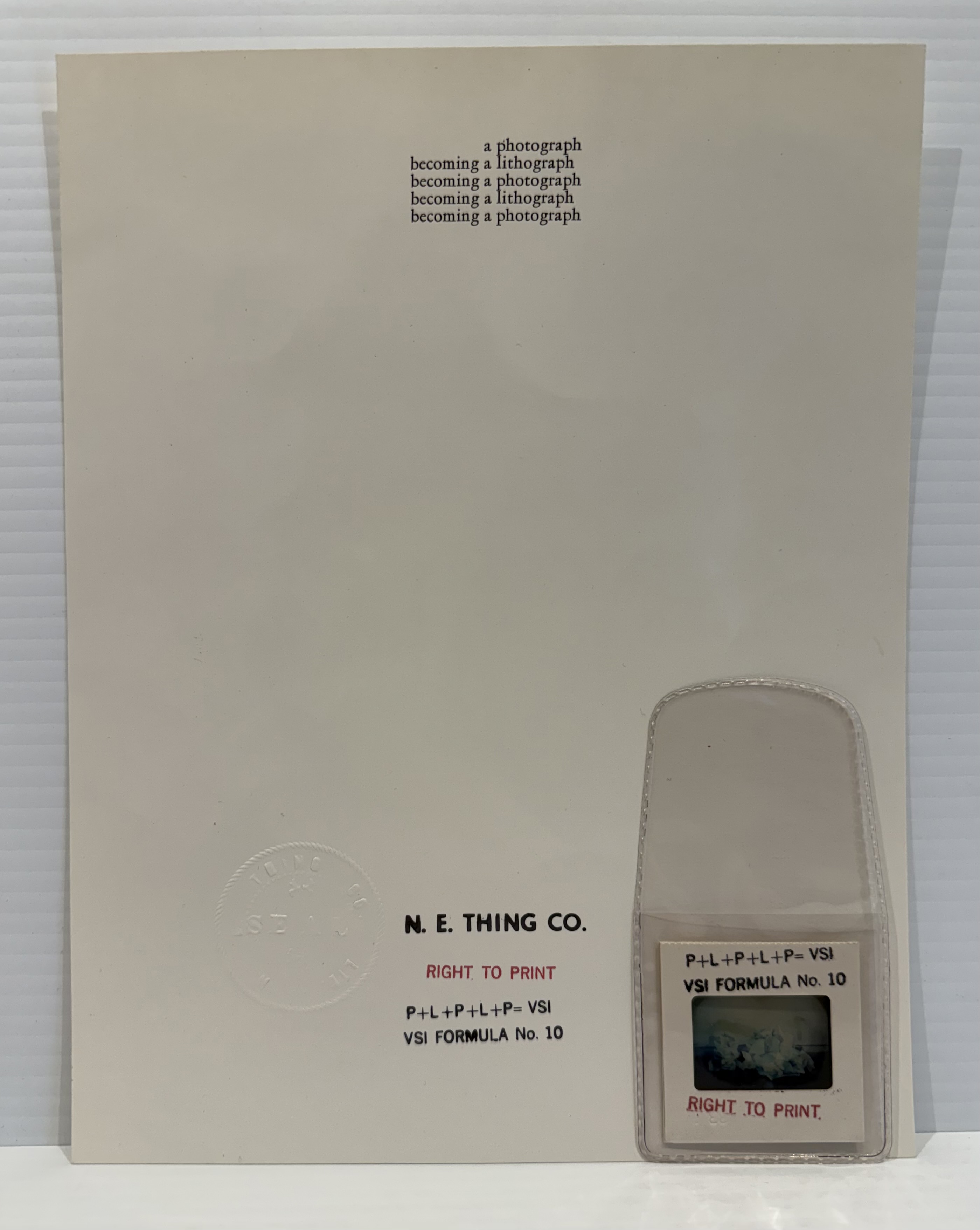 For his NSCAD lithograph Baxter carried this sequence of transformations back onto itself in a characteristically conceptual procedure of self-reflexiveness. As indicated by the title, P+L+P+L+P=VSI (where P stands for photograph, L for lithograph and VSI for visual sensitivity information), what began in a photographic format (slides) became an offset lithograph for Art in America, which in turn was photographed for printing on a metal lithographic plate. The final photographic transformation took place after the edition was printed. In what Baxter called “a gesture of complete consciousness of the medium,” all fifty prints were crumpled, piled on the floor and then photographed. This series of transformations on the one side of the equation was equal to the total amount of VSI available in the piece as a whole. Those who purchased this work received a flattened-out print as well as a title card and a slide of the pile of crumpled prints.”