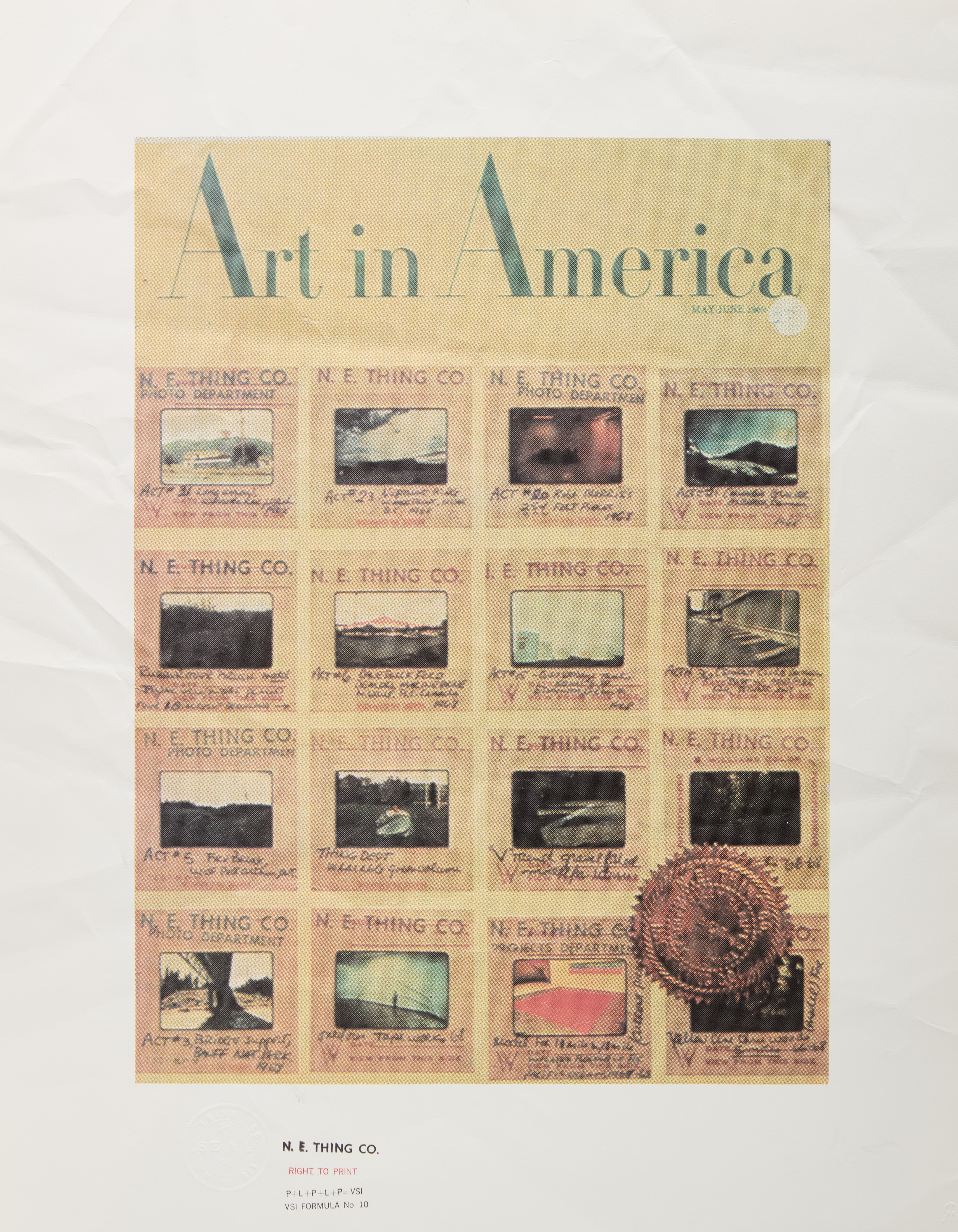 “Ian Baxter [N.E. Thing Co.]’s NSCAD print incorporated his 1969 project of a cover design for the May-June issue of Art in America. The cover reproduced sixteen slide photographs documenting previous work by N.E. Thing Co., principally images of landscapes and urban or industrial sites that had been transformed into art by virtue of N.E. Thing Co.’s process of declaration known as ACT, which stood for Aesthetically Claimed Things. Its corollary, ART, stood for Aesthetically Rejected Things.